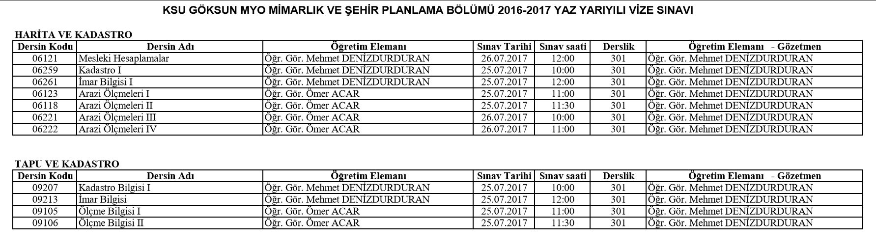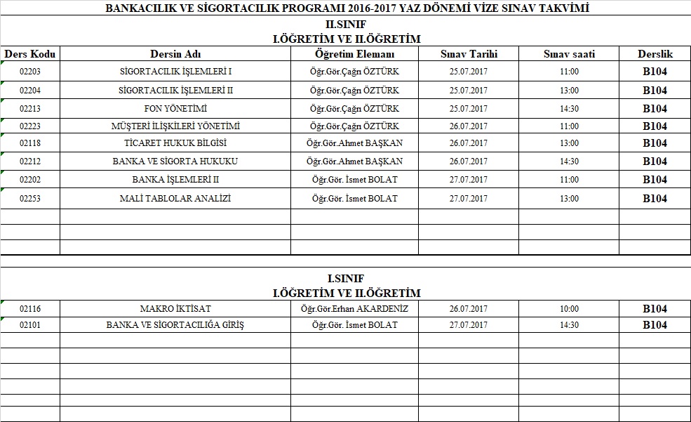 2016-2017 Yaz Dönemi VizeTarihleri