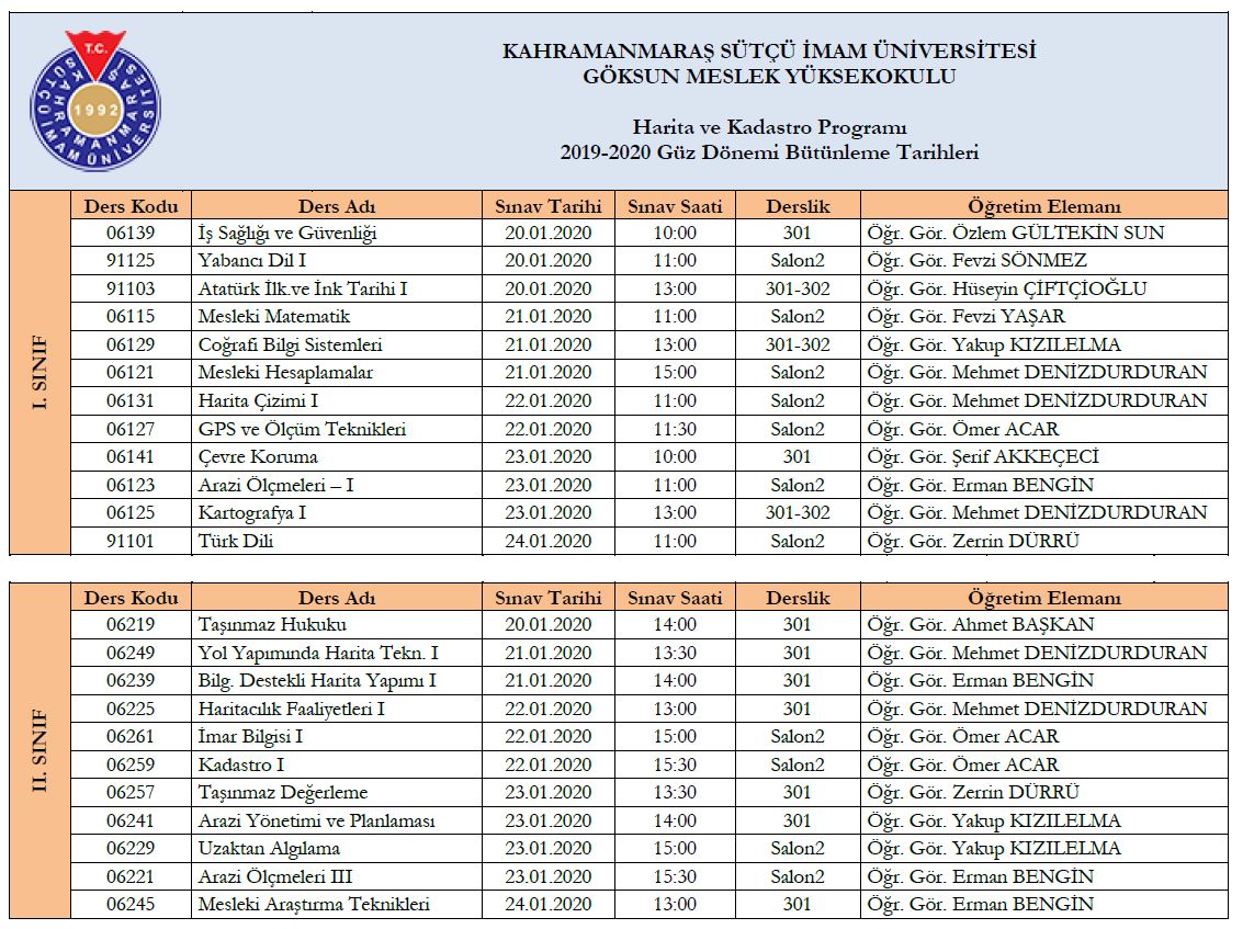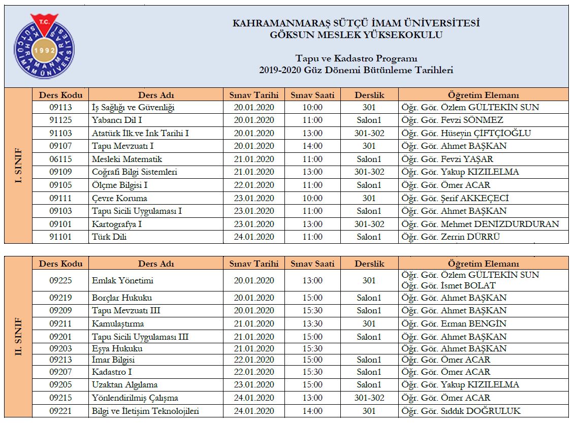 2019-2020 Eğitim Öğretim Yılı Güz Dönemi Bütünleme Takvimi
